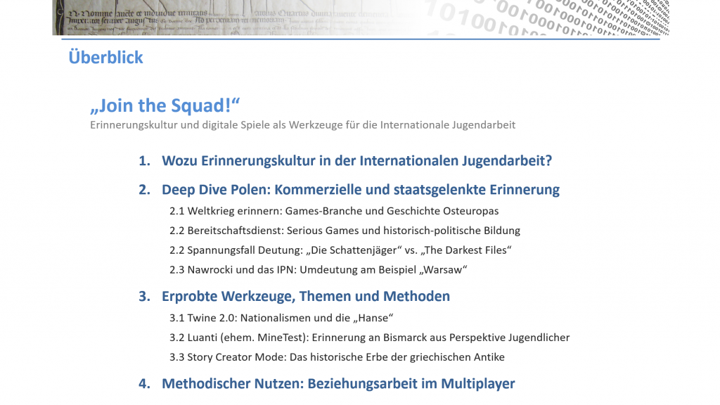 Auf den Digital Transformer Days am 15.11.2025 stellte mein Vortrag „Join the Squad! Erinnerungskultur und digitale Spiele als Werkzeuge für die Internationale Jugendarbeit“ methodische Vorgehensweisen und historische Kontexte vor. Mit ihnen können internationale Begegnungen junger Menschen zu erinnerungskulturellen Themen gerade mithilfe von digitalen Spielen gelingen.