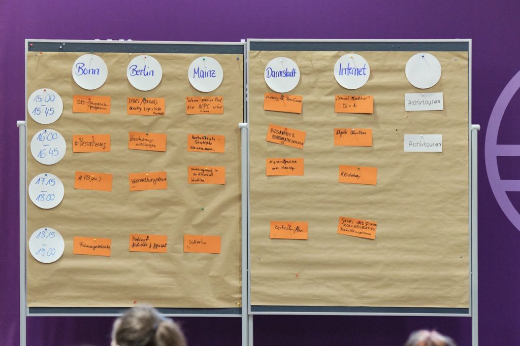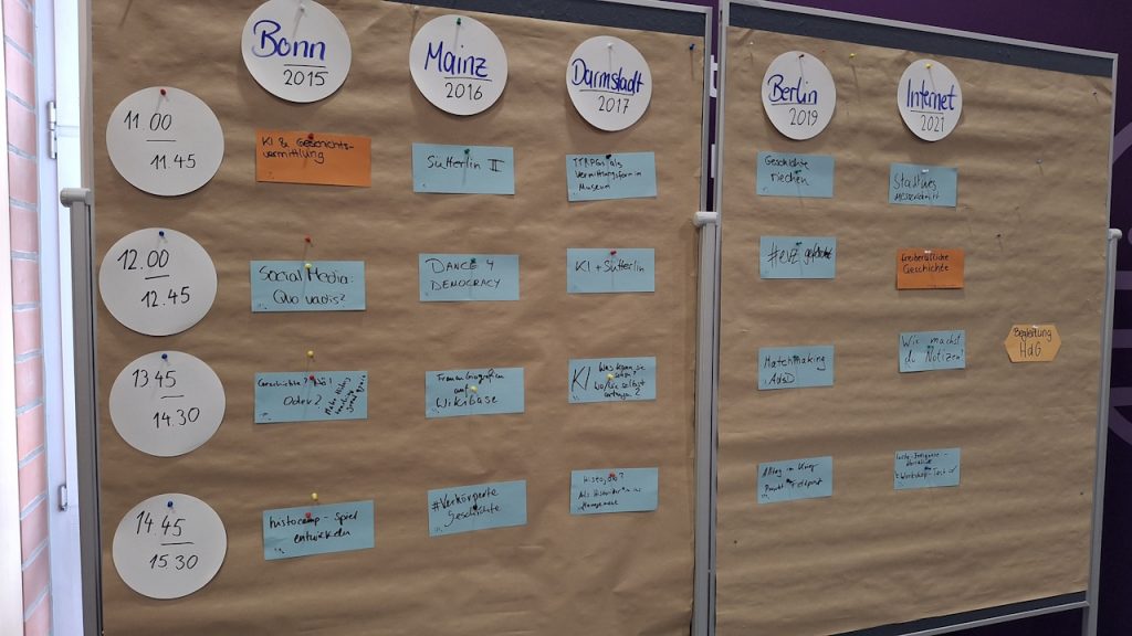 Seit zehn Jahren führt das histocamp Menschen zusammen, die mit Geschichte in ihren Professionen arbeiten. Den Geist eines solchen Barcamps prägt, dass alle Teilnehmenden möglichst hierarchiefrei und respektvoll miteinander kollaborieren. Das beginnt schon bei der Tagesplanung, die sich auch dieses Mal gleich an die Begrüßung anschloss. Teilnehmende bilden geduldig eine Schlange und tragen knapp ihr Interesse vor. Ebenfalls Interessierte geben sich per Handzeichen zu erkennen. Themen werden so nicht durch vermeintlich professorale Reputation platziert, sondern durch ein echtes Interesse aller Anwesenden. Entsprechend der Menge an Meldungen fügen sich die vorgestellten Themenangebote nach und nach in die passenden Raumgrößen der verfügbaren Slots hinein.